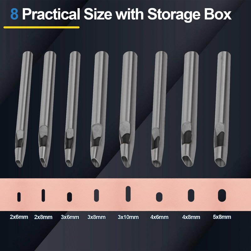 - 【8 Practical Size】: Kits includes 8 different sizes leather craft punch tools, it's 2x6mm, 2x8mm, 3x6mm, 3x8mm, 3x10mm, 4x6mm, 4x8mm, 5x8mm, oval shape, meet most punching size requirements.