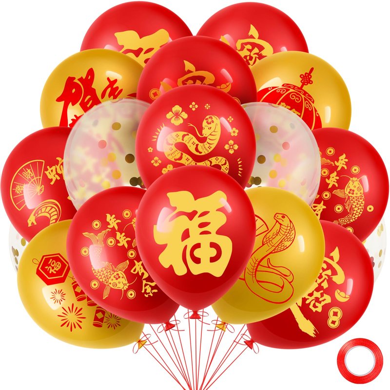 - 🎈Unique Chinese New Year Designs: These Chinese new year party decoration balloons are designed with ten different elaborate patterns and characters, includes Fu character, lantern, snake, Chinese knots, gold coins, fish and so on, taking red & gold as theme colors, which means luck, joy, happiness, full of strong Chinese characteristics.