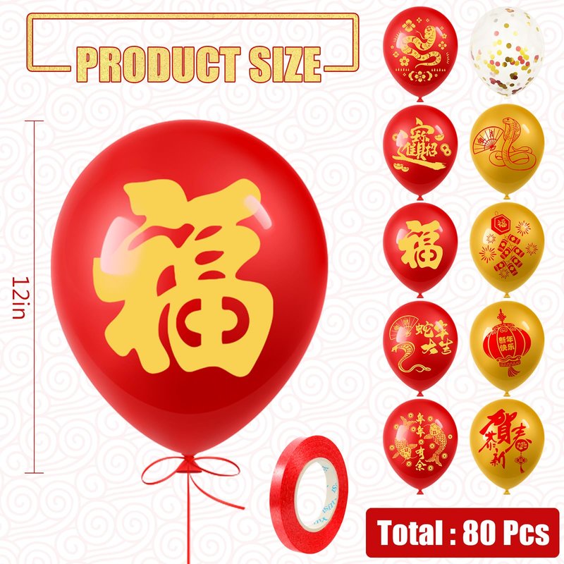 - 🎈The Package Content: There are totally 80 PCS of Chinese new year party balloons with ten different patterns, each pattern has eight pieces, the size of each happy new year party balloon is 12 inch, sufficient quantities to meet your various needs for home and party decoration.