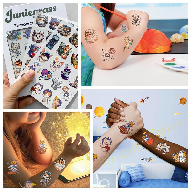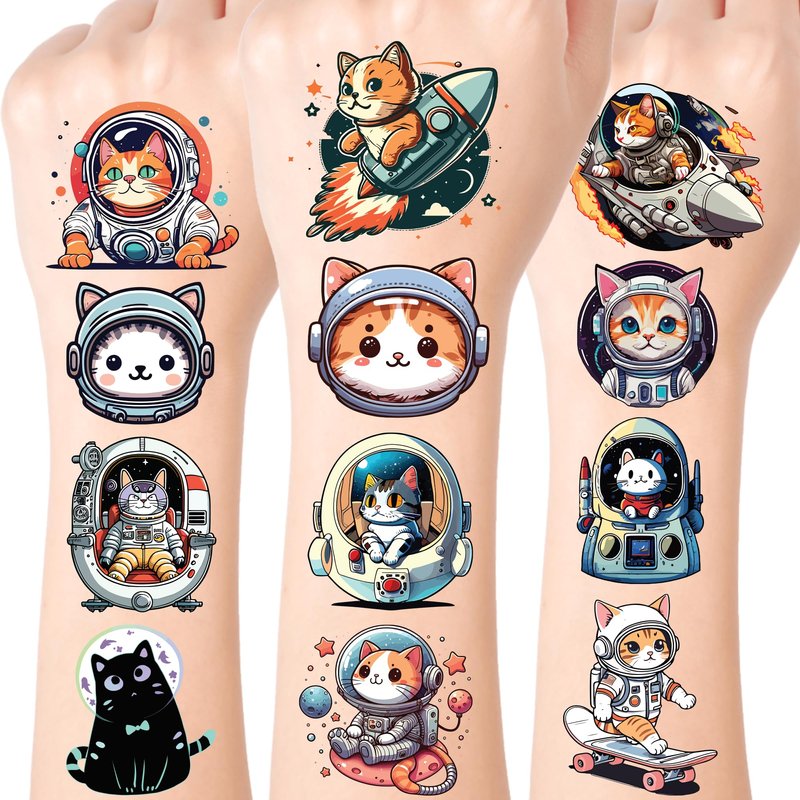 Package: There are 4 sheets space cat temporary tattoos for party favors