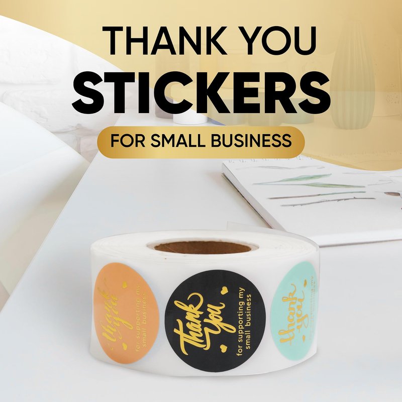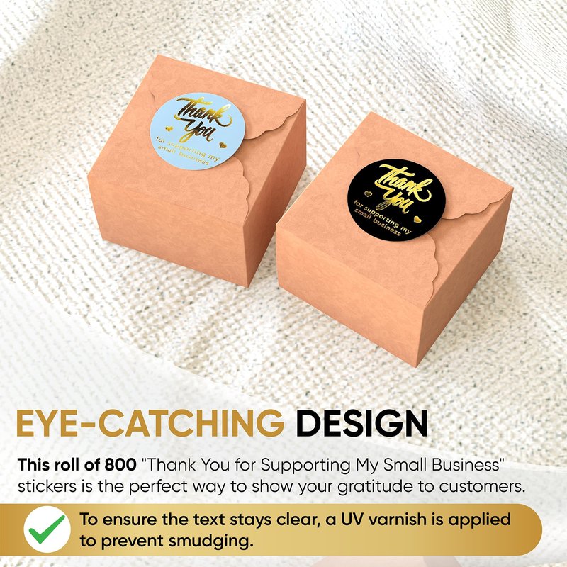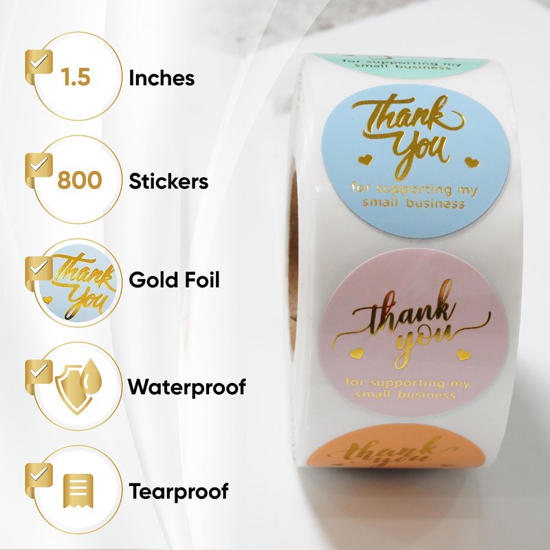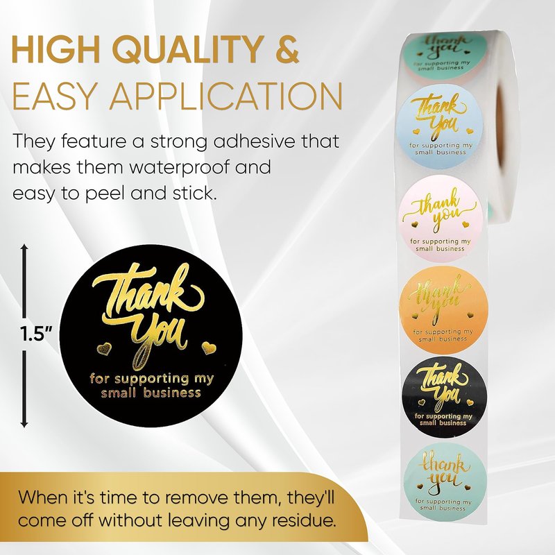- ⭐EYE-CATCHING DESIGN: You receive 800 pieces (1.5 inch) in a roll with thank you for supporting my small business written on them in 4 different fronts. They are printed in 5 attractive colors with four gold foil fonts and UV varnish to prevent ink from smearing