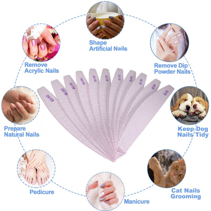 - Durable and Coarse 80 Grit: The 80 grit nail files are super coarse, so that they can trim much more efficient and faster to remove false nails, gel nails, acrylic nails, dip powder nails, poly extension nails, false tips, etc.; They are sturdy, durable, and thick enough to last a longer time, and they are reusable and washable, making them a great addition to any manicure kit;