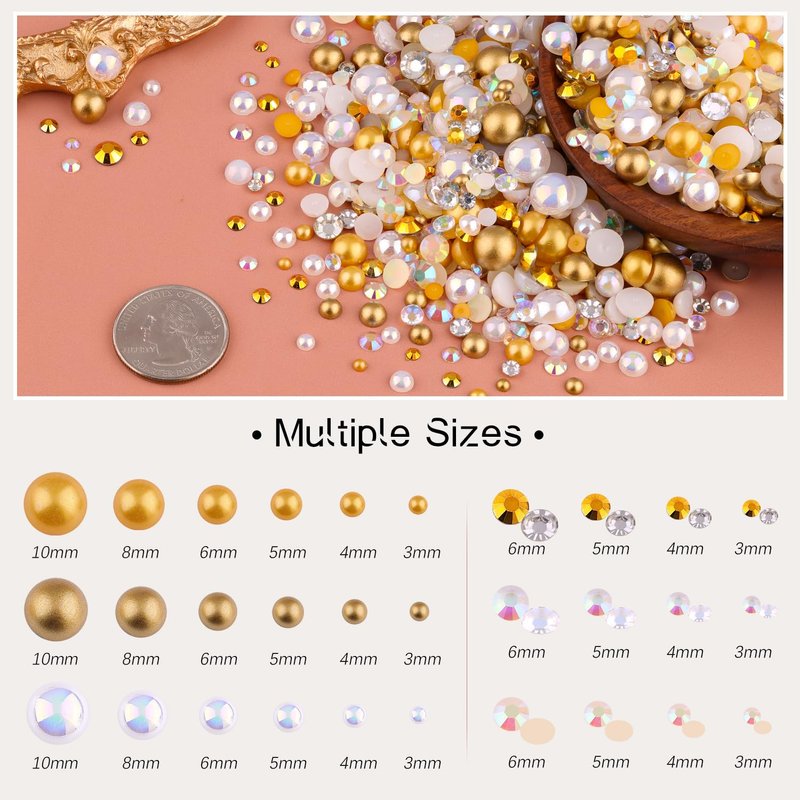 - ✦MIXED SIZE: This set contains six sizes of half pearls (3/4/5/6/8/10mm) and four sizes of round rhinestones (3/4/5/6mm), and each gem comes in 3 different colors. The various size range of pearls and gems can be used for nail art, craft, and decoration.