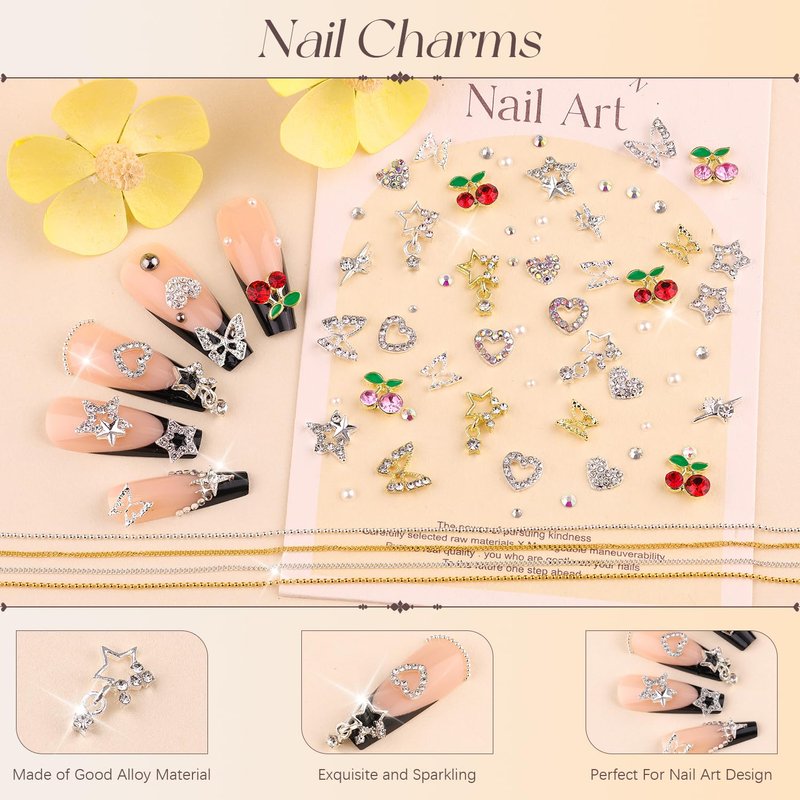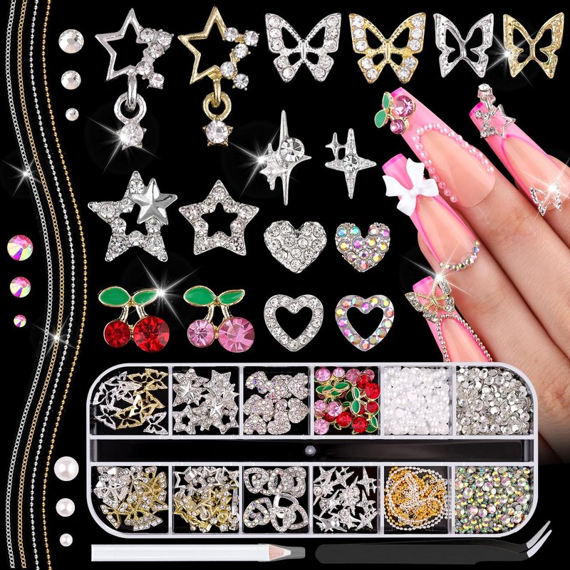 - ✨Lastest Charming Design -- These nail charms are designed with a fashion shaped with crystal-encrusted, such as butterfly, star, heart, starlight and cherry. These delicate and exquisite charms and different sizes flatback rhinestones and pearl can assist you to create a eye-catching nail design. This kit is perfect for your nail decoration, making your nail art more shiny and attractive.