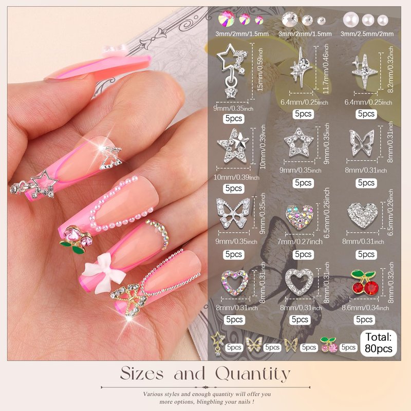 ✨The package not only includes 80Pcs silver 3D nail charms, which available in 16 styles, but also offers flatback rhinestones and pearls in different sizes and nail chains. Tweezers and picking pencil are also equipped for your convenience. Enough quantity and different sizes charms will satisfy your daily design use and replace needs, keep your nails sparkling all the times.✨Lastest Charming Design -- These nail charms are designed with a fashion shaped with crystal-encrusted, such as butterfly, star, heart, starlight and cherry. These delicate and exquisite charms and different sizes flatback rhinestones and pearl can assist you to create a eye-catching nail design. This kit is perfect for your nail decoration, making your nail art more shiny and attractive.✨High Quality Material -- These nail charms are made of premium quality stainless alloy and sturdy K9 glass rhinestones, sturdy and not easy to break or fade, rust or tarnish. Our charms meet the needs of different nail art designs. A good material can add a higher sense of texture and visual effect to nail art works.✨Easy To Use -- After applying nail polish and applying enough gel on the nails, use tools to pick up the charms onto your nails to create your fabulous DIY designs. And cure them under UV/LED light for 60-90 seconds, then apply the nail art with top coat, cure them for another 60-90 seconds, your nail art is done.✨Wide Application -- Our sparkling nail charms not only can be used for nail art decor, but also can be applied to decorate your clothes, computers, phones, shoes, bags, craft, guitars, hats, hair clips and so on. Bedazzle your life.