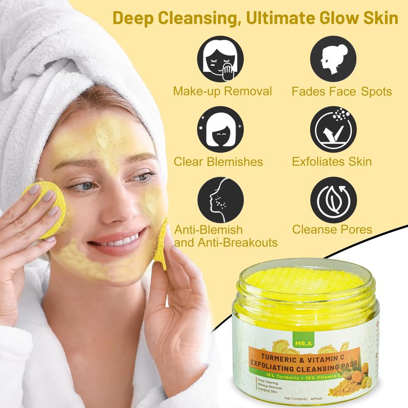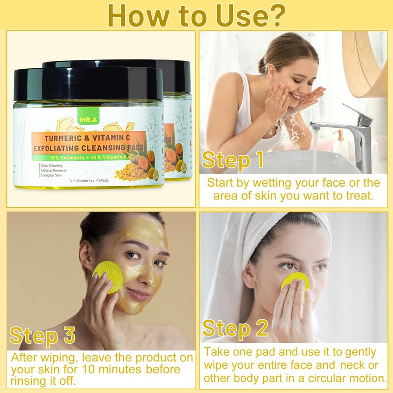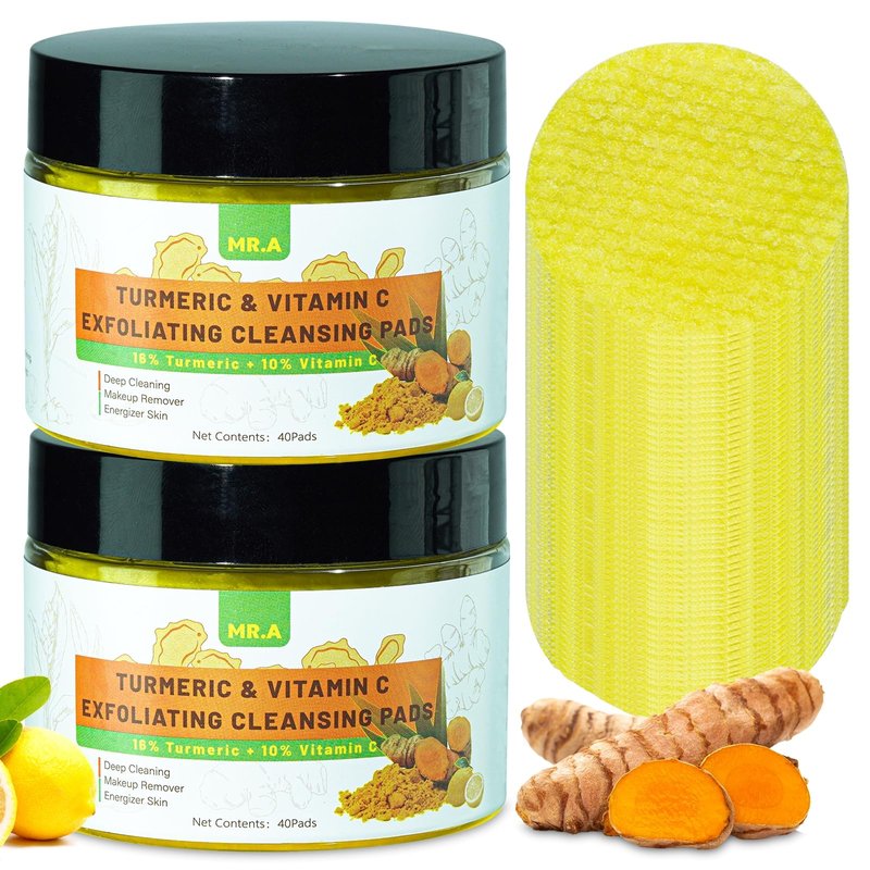 - 【Turmeric Face Exfoliator】Tumeric pads enriched with panthenol (vitamin B5), glycerin, vitamin c, vitamin e and more turmeric extract than others, Mr.A turmeric face scrub pads not only moisturize the skin but also support collagen production.
