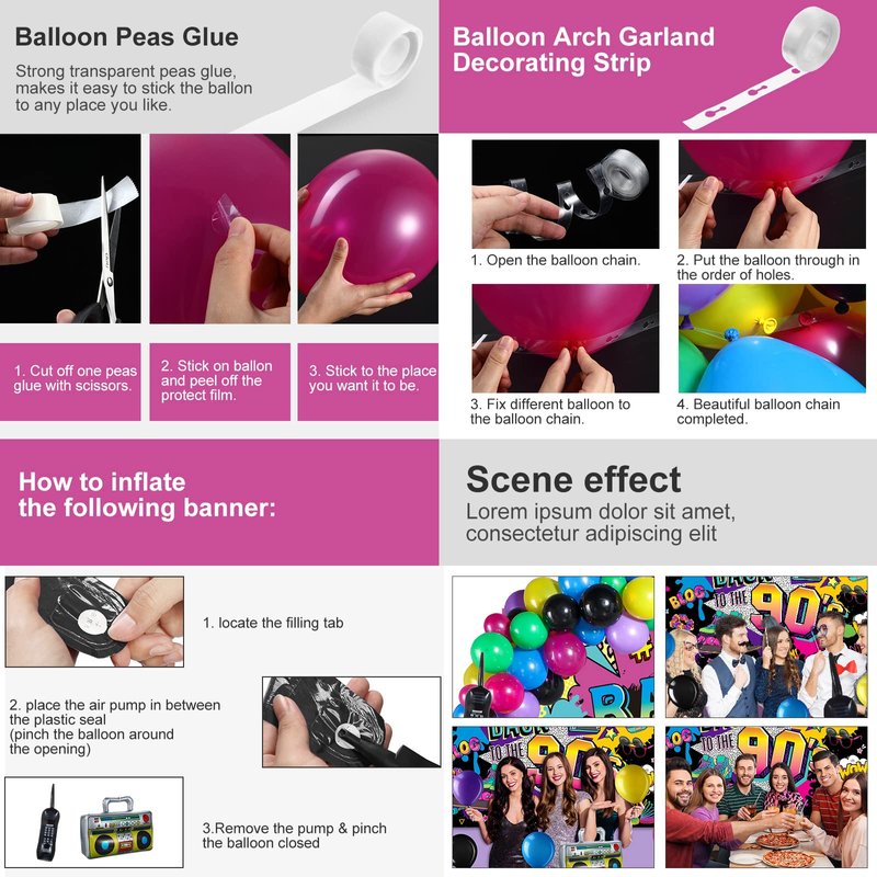 - What's Included: this party supplies set includes 43.3 x 72.8 inch backdrop, inflatable radio boombox and mobile phone, 55 pieces balloons of different color, dispensing, balloon chain, black ribbon and balloon knotter, we provide 2 styles for you to choose, 80s and 90s