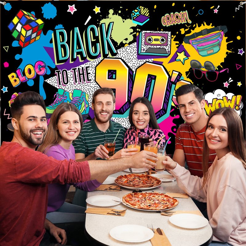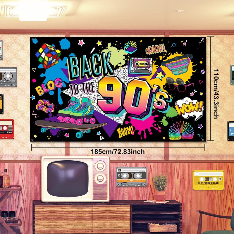- Retro Party Design: 90's theme party decoration feature a funny 90's design with classic neon and rock themes throughout the backdrop; [Back to The 90's] Backdrop create a pleasant coordinated disco and rock party; That will be unforgettable