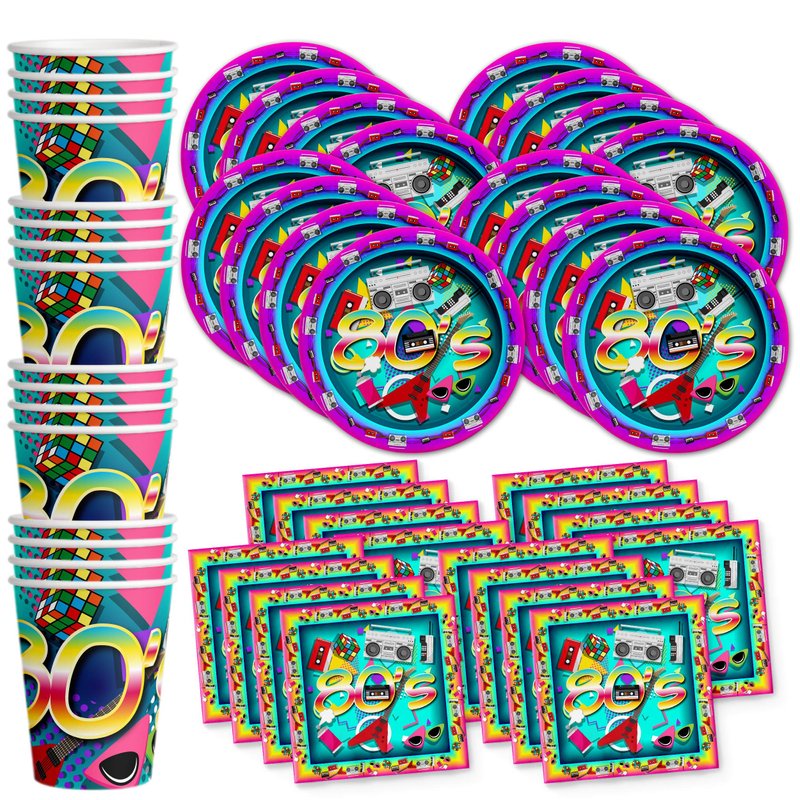 80's Party Supplies - 80's Theme Birthday Party Supplies - Retro Party Supplies | Tableware Set Includes Plates Napkins and Cups | Kit for 16