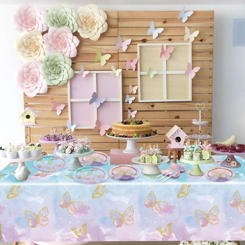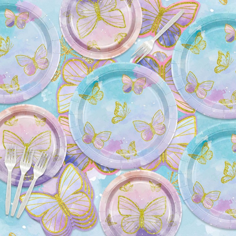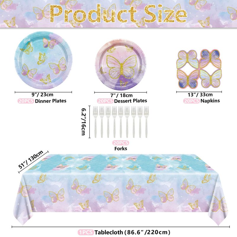 - Package Includes - These butterfly decorations include 20 x 9" pink blue butterfly plates, 20 x 7" pink purple butterfly plates, 20 x butterfly napkins, 1 x butterfly tablecloth, and 20 x forks.