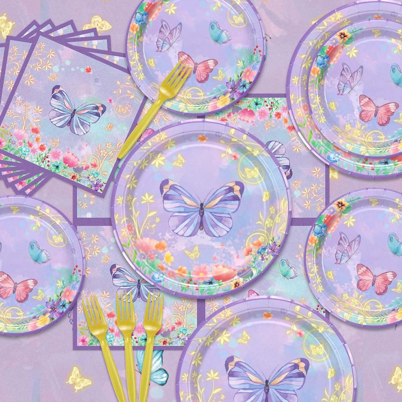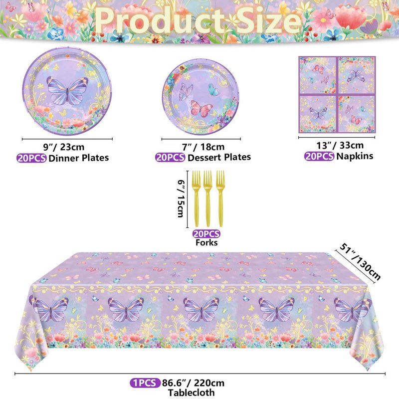 - Package Includes - The butterfly kit includes 20 x 9" dinner plates, 20 x 7" dessert plates, 20 x butterfly napkins, 1 x butterfly tablecloth, and 20 x forks.