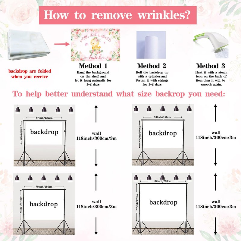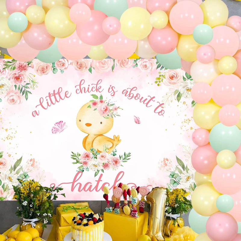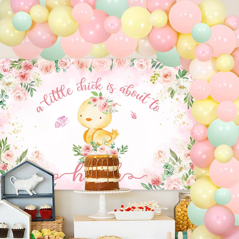- Chicken Themed Backdrop: The backdrop features pink flowers and chick silhouettes printed on durable material that measures 5 x 3 ft for a focal point photo station.The letter "a little chick is about to hatch" printed on the backdrop is very suitable for baby shower parties.