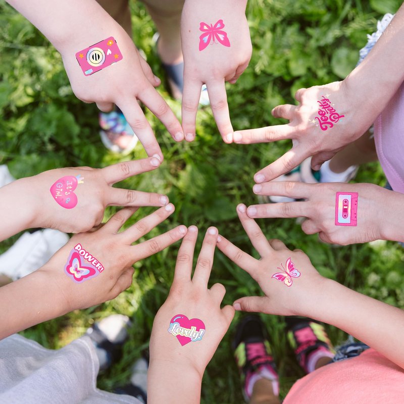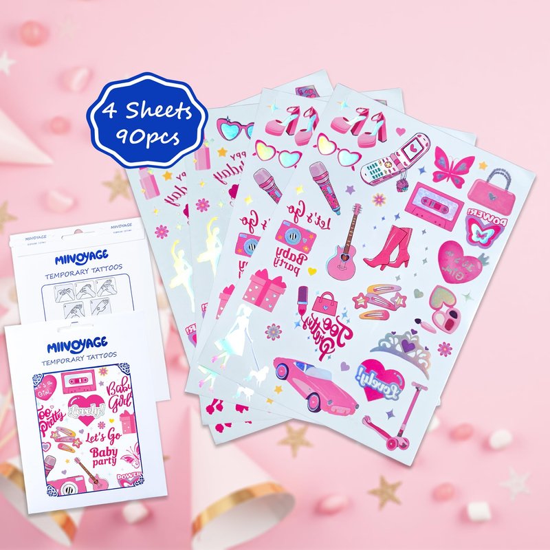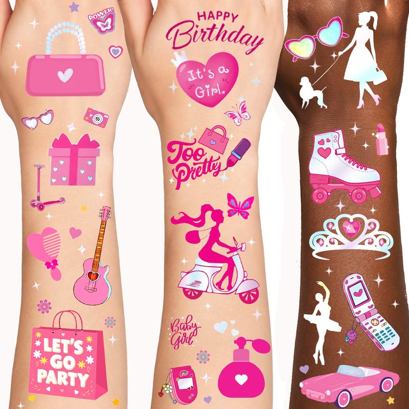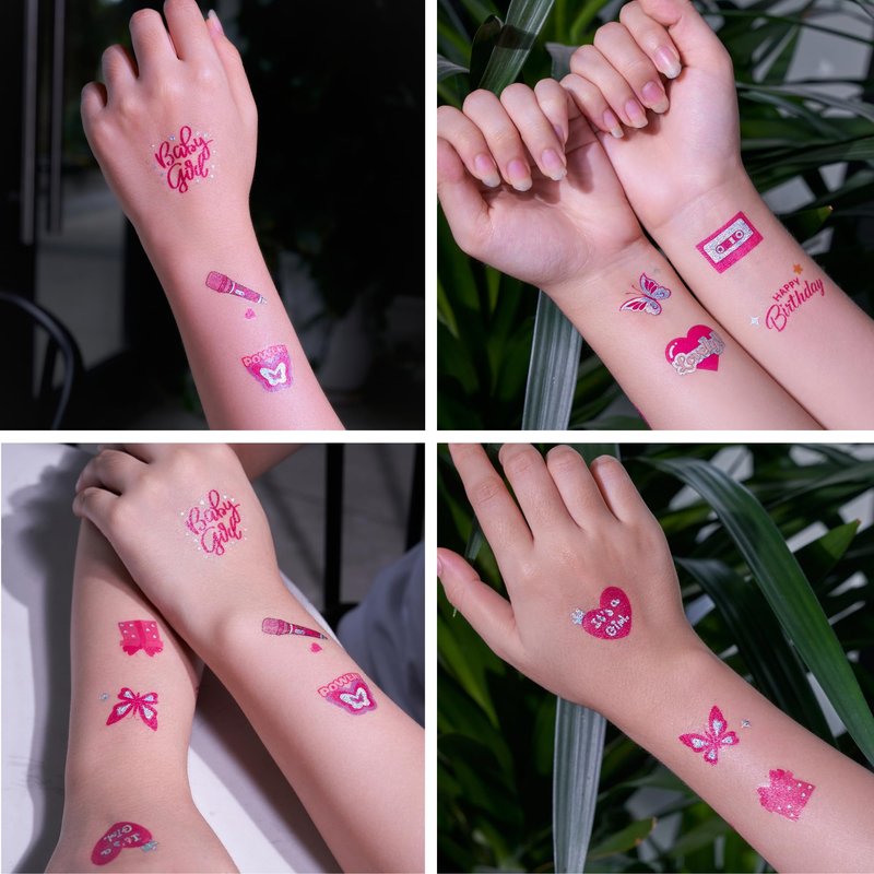 - 🎀 Glitter Pink Tattoo Set: Our Pink temporary tattoo set includes 4 sheets with over 82 cute PCS, many beautiful designs, perfect for birthday and party decorations for girls