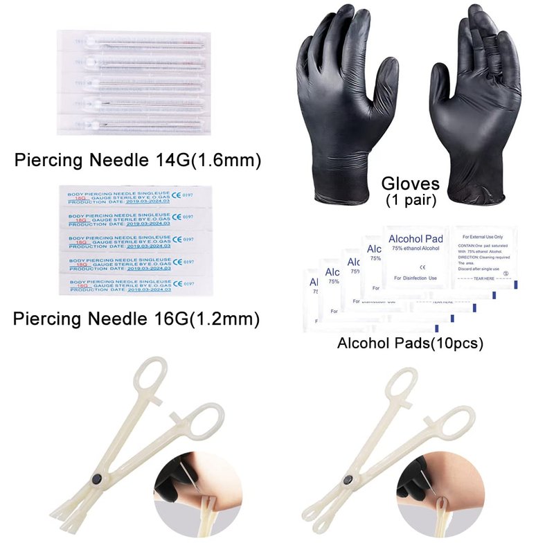 - Piercing Kit Tools: 5PCS 14G(=1.6mm) piercing needles and 5PCS 16G(1.2mm) piercing needles, 2PCS piercing clamps, 2PCS black latex gloves, 10PCS A-lcohol pads, . All items are 100% sterilized using EO gas.
