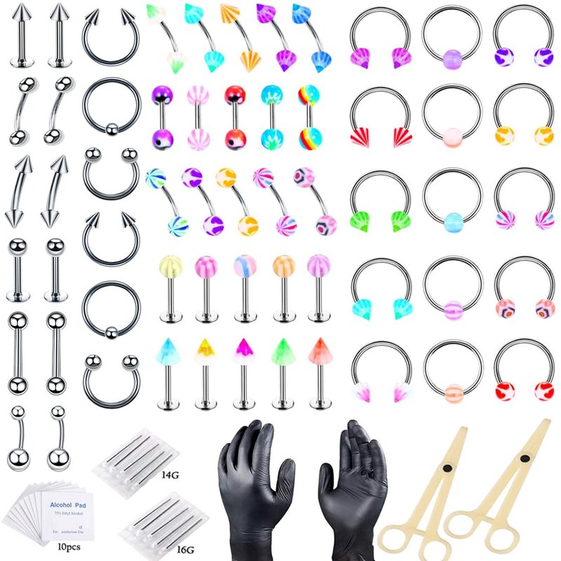 - Body Piercing Kit: 82PCS piercing jewelry for nose, ear, septum, lip, tongue, eyebrow, tragus, cartilage,belly, daith and helix, etc. Needles, clamps and tools are included.