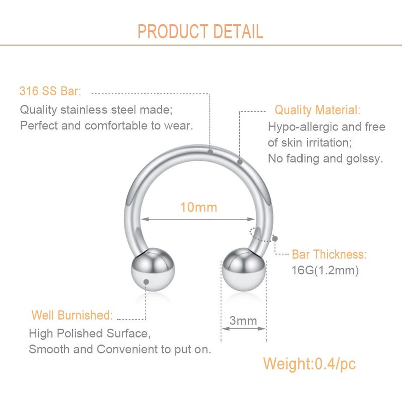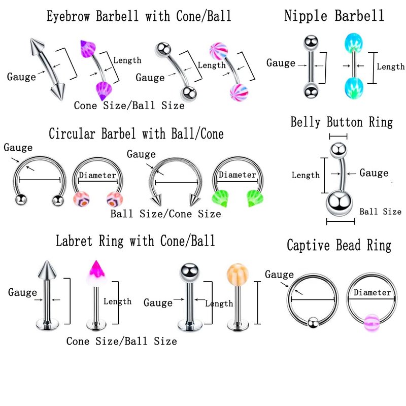 - Body Jewelry: 7PCS ball closure ring (BCR) 16G(bar thick=1.2mm) , 14PCS septum rings(CBR) 16G, 14PCS eyebrow rings16G, 14PCS lip rings 16G, 7PCS tongue rings 14G(bar thick=1.6mm) , 2PCS belly button rings 14G. Use: tongue piercing kit, lip piercing kit, septum piercing kit, tragus piercing kit, cartilage piercing kit, belly piercing kit, nipple piercing kit.