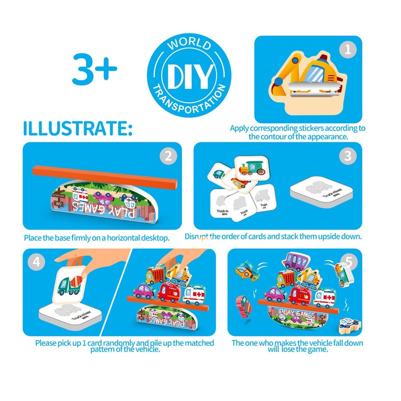 - 【HOW TO PLAY】Fristly (DIY) : Child use sticker to cover the plastic shape for Traffic ( DIY )Secondly ( Montessori Alphabet Educational Learning ): can put the dinosur on the card to fix exaclty shape of Traffic , and another side of card is Taffic's name and photo .Thirthdly ( Balance ): pk game to play for balance game .