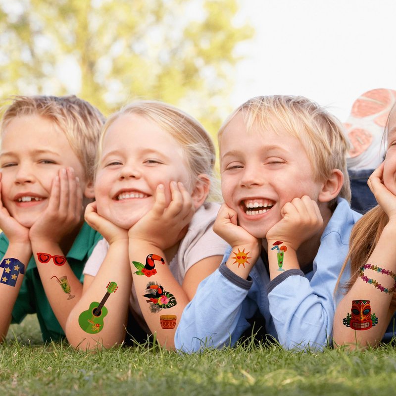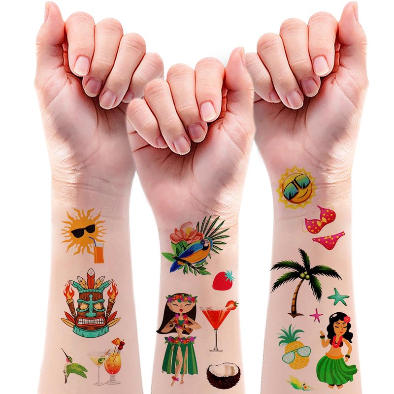 - Material: These Hawaiian Luau temporary tattoos are made of high quality paper,safe for your kid's skin. Simply wet the tattoo with water and stick transferred them onto your body, hands, faces and arm you like.