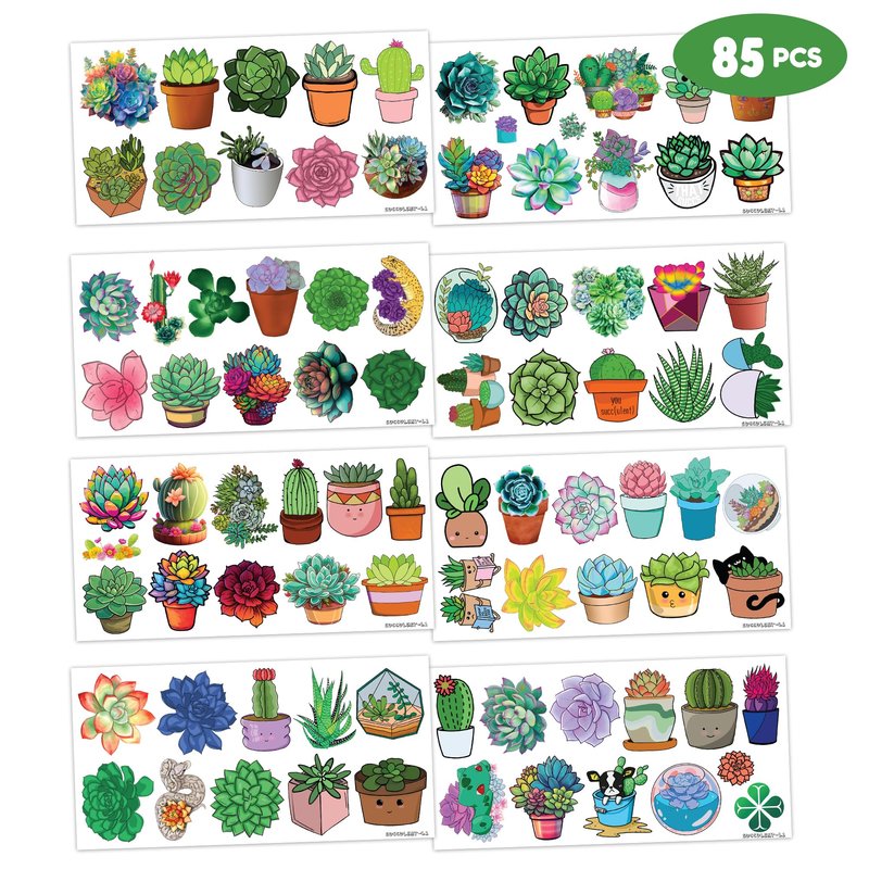 - 🌵 PERFECT TATTOOS FOR NATURE-THEMED DECORATION, SUCCULENT PLANTS : Succulent tattoos for people who love nature, plants, flowers and especially succulents. Featuring 8 sheets with 85 pcs of lovely, fun and colorful design. Each sheet measures 6.1 * 3.1 inches. You can temporarily tattoo them on your body or objects such as phones, bottles, laptop…