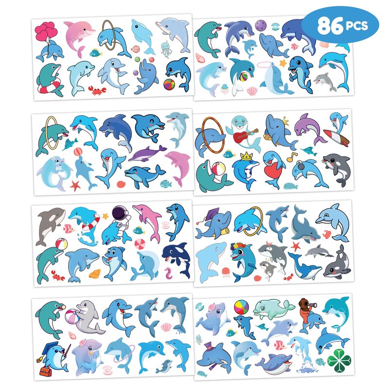 86 PCS 8 Sheet Dolphin Temporary Tattoos Sticker for Kids Cute Sea Animal Fish Dolphin Birthday Party Decorations Supplies Favors Gifts Boys Girls Baby Shower Cute Tattoo School Reward Themed