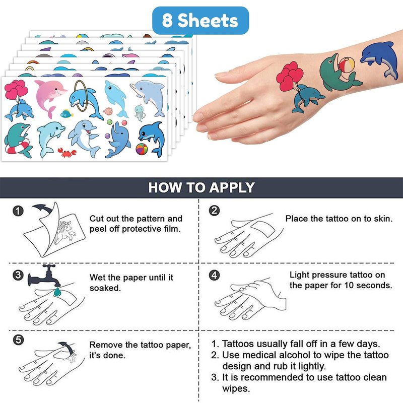 - 🐬 EASY TO USE AND REMOVE : You can place them on your hands, arms, face, or any comfortable area. Simply cut out each tattoo from the sheets and remove the clear protective layer. Wet the tattoo thoroughly with water, wait for 20-30 seconds, and then remove the backing paper. The result will be a velvety, long-lasting tattoo.