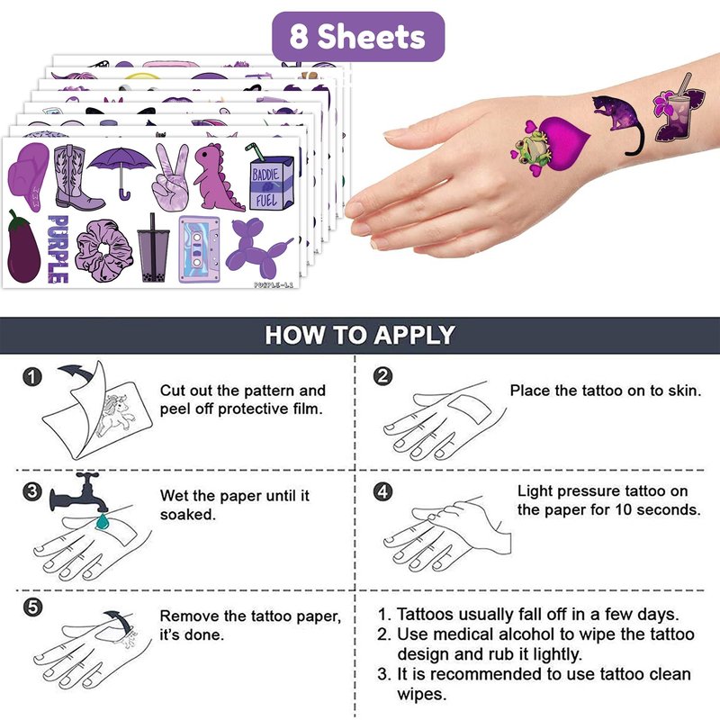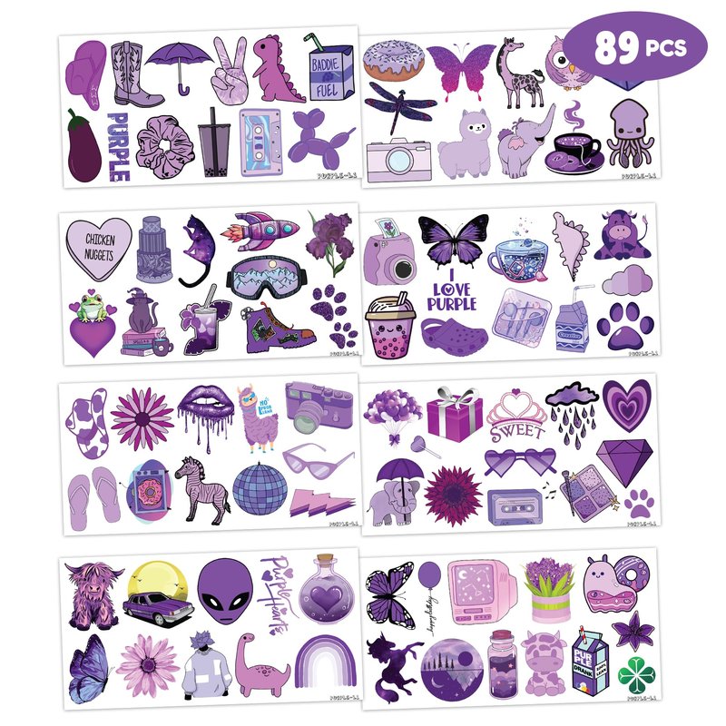 - 💜 PERFECT TATTOOS FOR PURPLE THEMED DECORATION: Purple tattoos for people who love purple. Featuring 8 sheets with 89 pcs of lovely, fun and colorful design: animal, heart, flower… Each sheet measures 6.1 * 3.1 inches. You can temporarily tattoo them on your body or objects such as phones, bottles, laptop…