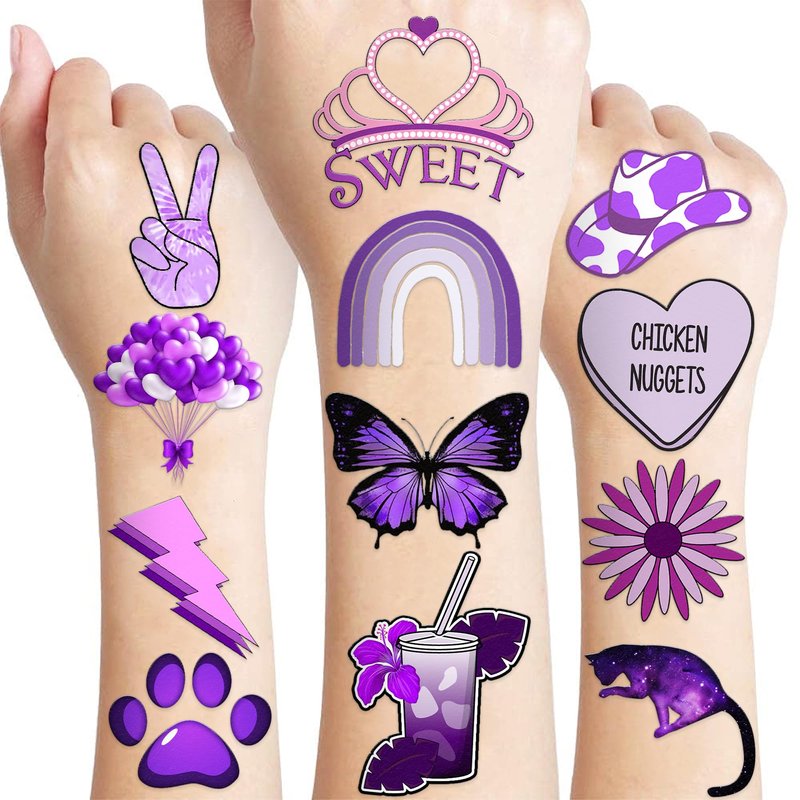 - 💜FUN GIFT IDEAS FOR PURPLE BIRTHDAY PARTY DECORATIONS SUPPLIES: PURPLE TATTOOS perfect for themed party, outdoor parties, birthday parties, school rewards and other party events. PURPLE TATTOOS are also interesting and lovely gifts for your children. Complement your unique collection with a purple tattoo!