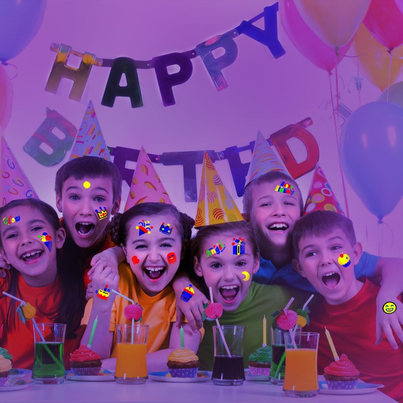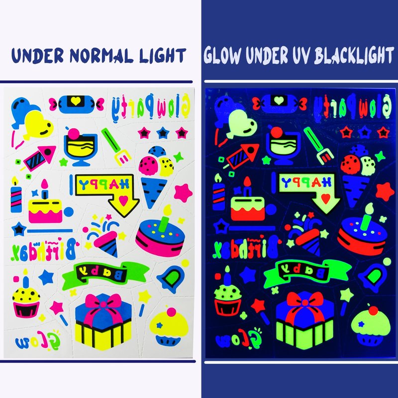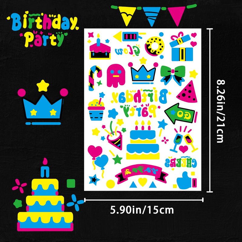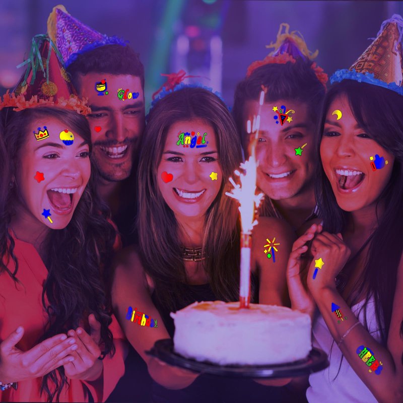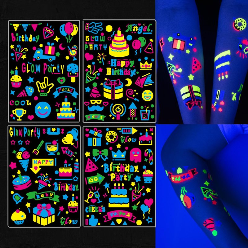 - 【Glow UV Neon Temporary Tattoos】It has 4 sheets,totally 89 PCS flash neon temporary tattoos for birthday party, including the bright lovely color birthday tattoo designs that kids and adult loves, cake, birthday hat, candle, gift, balloon, car, heart, star, crown, diamond, drink, donut, wine glass, candy, candy cane. Tattoos glow under UV light/black light!