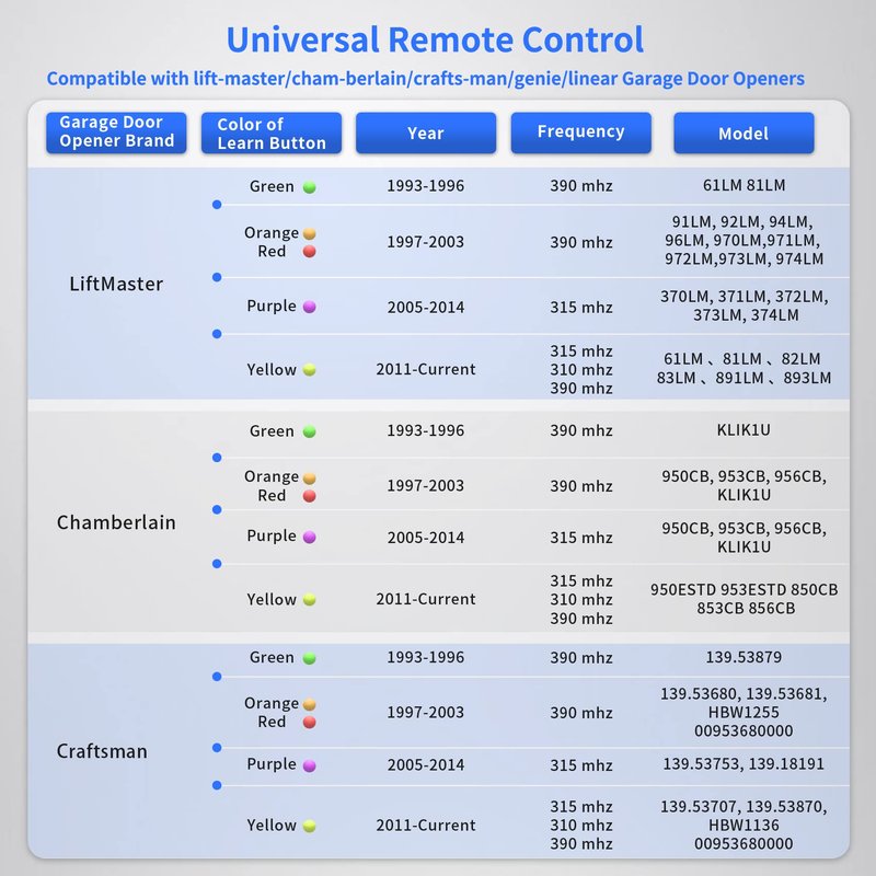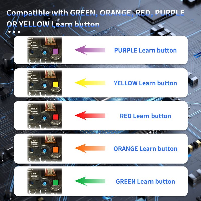 - Universal Compatibility: for LiftMaster/Chamberlain/Craftsman garage door opener manufactured from 1993 to current, compatible with universal garage door opener including Yellow/Purple/ Red/Orange/Green Learn Button. Please refer to the model list on the A+page for the applicable models.