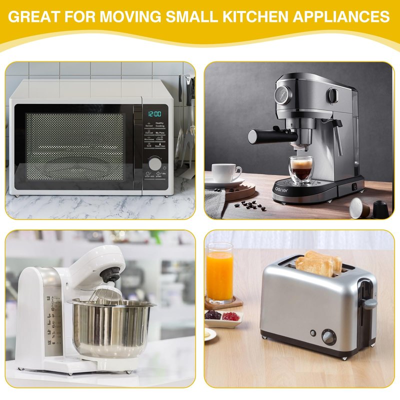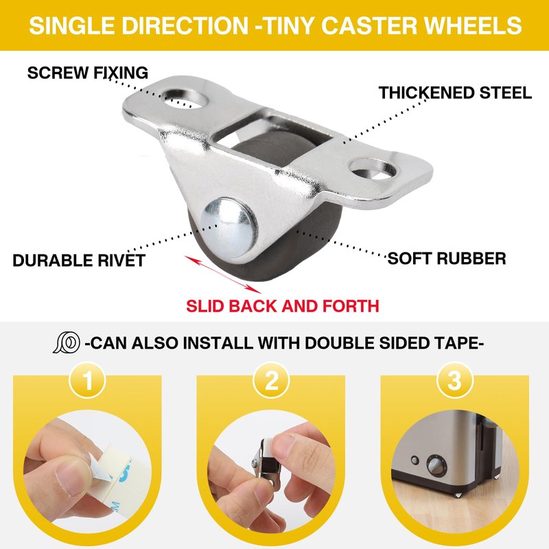 - 【Two Installation Methods】You can use screws to fix the tiny casters, or you can install them with double sided tape. They are perfect for small kitchen appliances that cannot be drilled.
