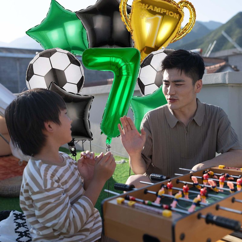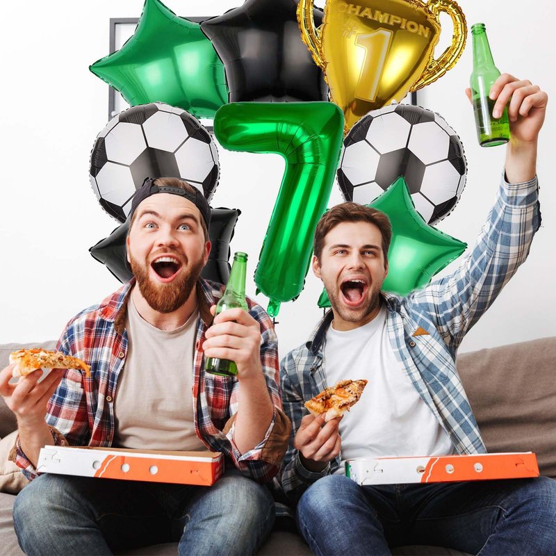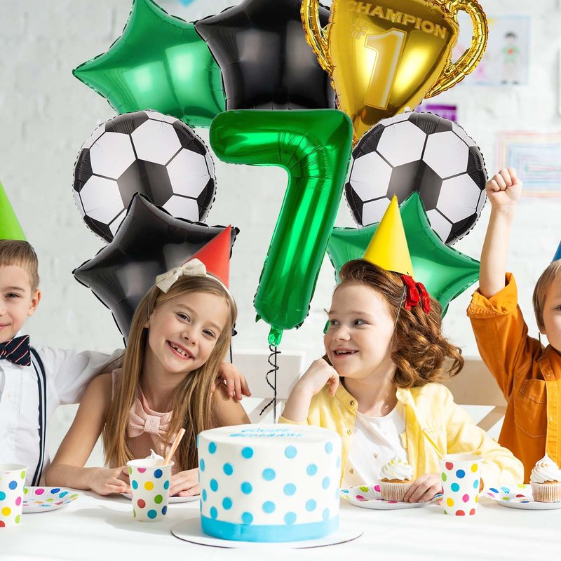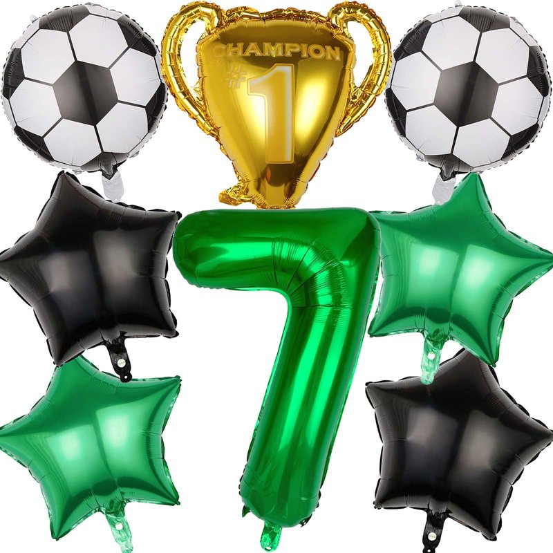 - 【Party Balloons Decorations Set】Our balloon decorations set includes 1PCS 32 inch green number balloon,1PCS trophy balloon, 2PCS soccer ball balloons,2PCS green star balloons,2PCS black star balloons,A roll of ribbon、A straw. The sufficient number of baloon is enough for you to decorate a unique party and make any dull space full of vitality and joy.