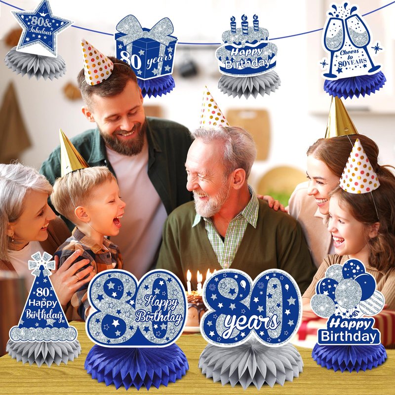 - What You Will Get: This package include 8 pieces of navy blue silver happy 80th birthday honeycomb centerpieces in 8 different designs, combine blue silver with happy 80th birthday elements, suitable for men and women, accompany you and your family and friends to spend an unforgettable and warm 80th birthday party