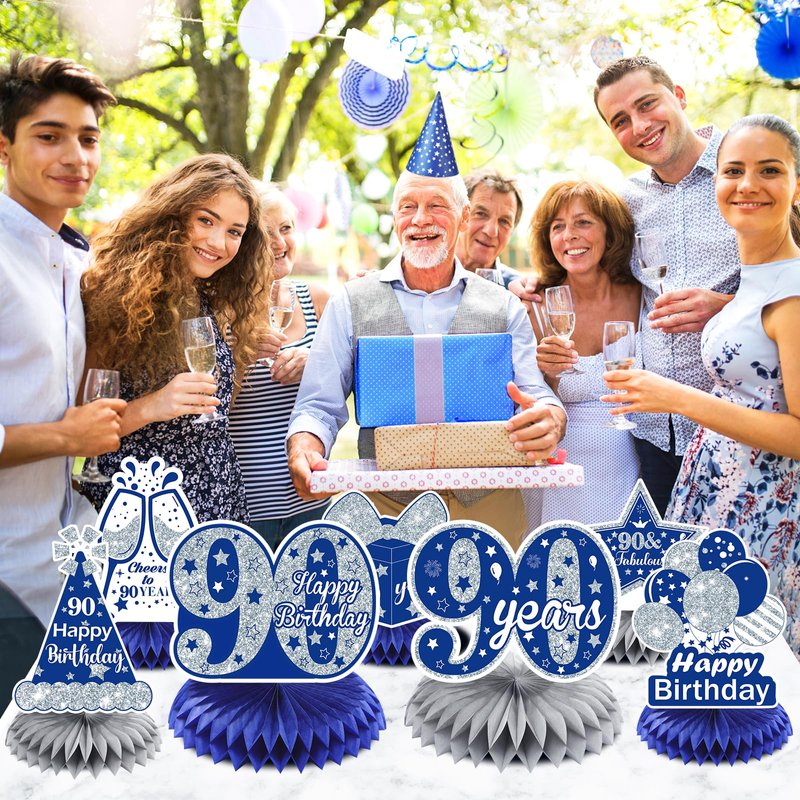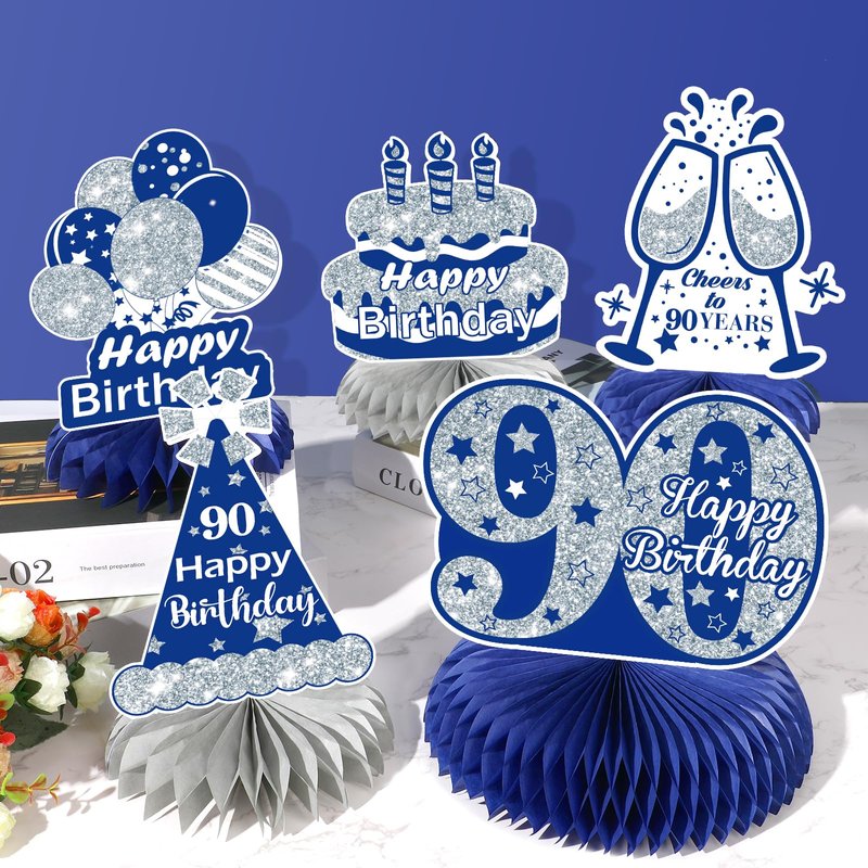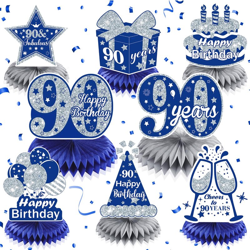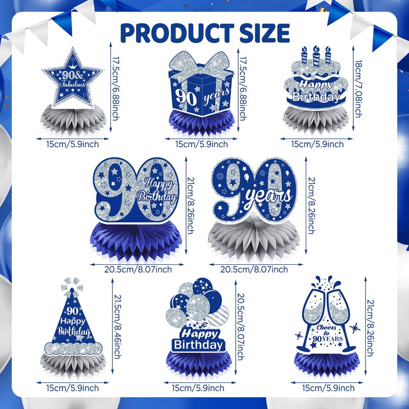 - What You Will Get: This package include 8 pieces of navy blue silver happy 90th birthday honeycomb centerpieces in 8 different designs, combine blue silver with happy 90th birthday elements, suitable for men and women, accompany you and your family and friends to spend an unforgettable and warm 90th birthday party