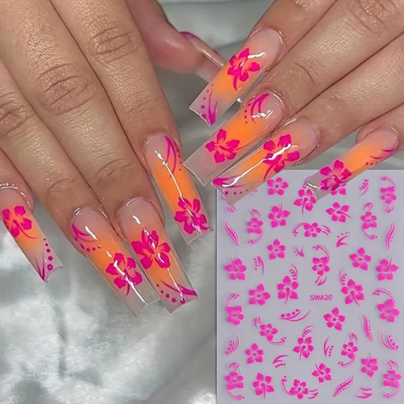 8PCS Hibiscus Flower Nail Art Stickers Summer Flowers Nail Decals Hot Pink Yellow White Pink 3D Self-Adhesive Hawaiian Hibiscus Flower Nail Art Designs Supplies for Women Girls Nail Art Decorations