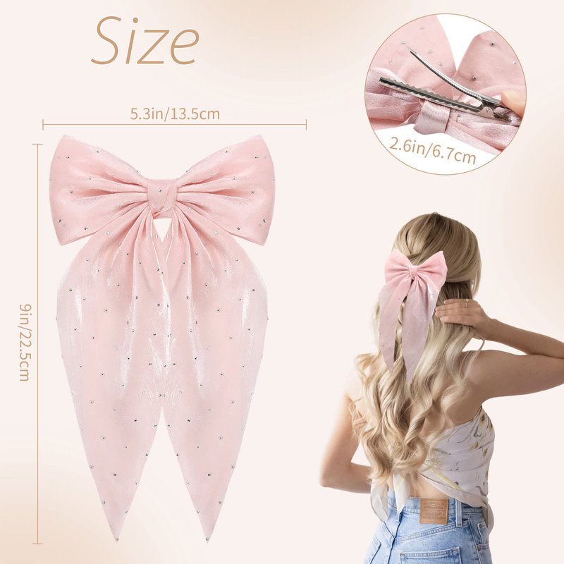 - đăPRODUCT SIZEă- Our rhinestone hair bows length is about 5.5 inches. The length of the clip is about 2.6 inches. large hair bows for girls is a great size to wear on the hair, satin hair bow clips is suitable for girls and women, Tulle bows will make you more beautiful and charming in any occasion.