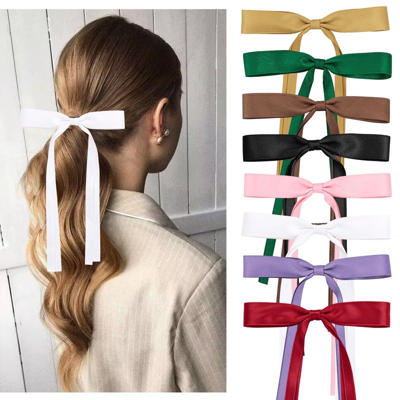 Kaiersi 8 pcs long ribbon bows hair clips silky satin alligator claw clips for women hair accessories.