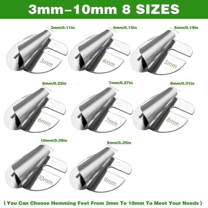 - 【Multiple Sizes Available】We provide you with 8 different sizes of rolled hem attachment for sewing machine, 3-10 mm, and various sizes for you to choose from, which can meet your diverse needs.