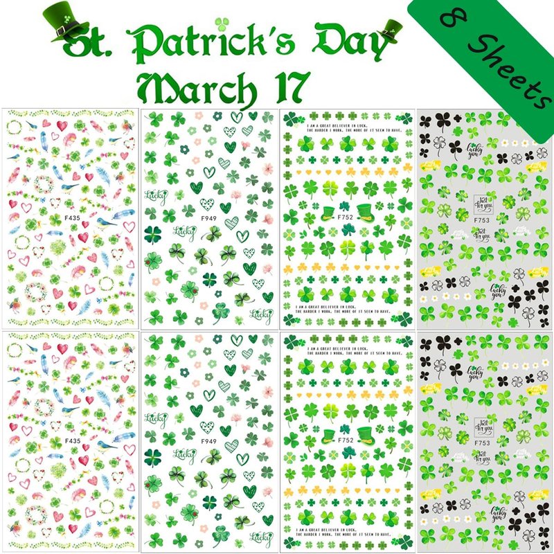 - ☘️St. Patrick's Day Nail Decor: You will get 8 Sheets St. Patrick's Day nail art sticker, Includes many different green clover nail design patterns, Great item gift for St. Patrick's Day party.