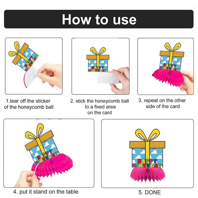 - Vibrant Designs: This set of 8 honeycomb centerpieces features colorful and festive toy-themed designs like cupcakes, balloons, presents, and birthday cakes.