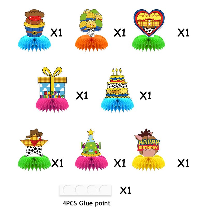 Celebrate birthdays in style with this vibrant set of 8 honeycomb centerpieces! These eye-catching 3D table decorations designed with colorful cartoon toys as theme elements. Crafted from durable materials, these centerpieces are perfect for adding a festive touch to any birthday party. Easily assemble and arrange them on tables, shelves, or as part of a larger display. With their playful designs and vivid hues, these centerpieces are sure to delight kids and adults alike, creating a joyful and memorable atmosphere for all to enjoy.