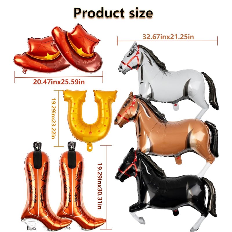 - Western Cowboy Balloons Set: You'll receive 2 cowgirl boot balloons(19.29"x 30.3"), 2 cowgirl hat balloons (20.47"*25.6"), and 3pcs 32.7"x 21.26" horse balloons (black/ white/dark brown) and a large U-shaped foil balloon(19.29"x 23.23"). These western balloons with abundant colors and large sizes are enough for your western themed party decorations