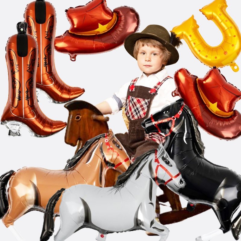 <p>Saddle up and get ready for a Western Cowboy Balloons Set that'll bring the spirit of the Wild West to your party! This set includes 2 cowgirl boot balloons, 2 cowgirl hat balloons, 3 horse balloons in black, white, and dark brown, and a large U-shaped foil balloon. With their abundant colors and large sizes, these balloons are perfect for setting the scene at your themed party.</p><p>Authentic Western Atmosphere: Whether you're a cowboy or a cowgirl at heart, our cowboy themed balloons set will transport you to the rugged charm and adventure of the frontier. From rustic decorations to line dancing, embrace the spirit of the Wild West and create unforgettable memories with friends and loved ones.</p><p>Versatile Vibes: Perfect for western-themed birthday bashes, cowgirl or cowboy parties, barn dances, rodeo parties, bachelorette parties with a twist, and even western weddings, our horse balloon set offers endless possibilities for fun and festive photo opportunities.</p><p>Premium Material: Crafted from high-quality aluminum foil material, our horse balloons feature clear printing that won't fade easily, ensuring a durable and long-lasting addition to your party decor. Let your inner cowgirl shine and saddle up for a memorable ride with these delightful western-inspired decorations!</p>