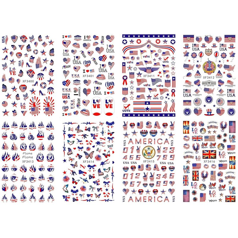 - 🔥Flag Day nail stickers: The package comes with 8 sheets July 4 Nail Art Stickers. various patterns for your choice, such as the American Flag, flame, and alphabet National emblem patterns with red, blue, and white colors. each paper size 3.54 x 3.15inches.