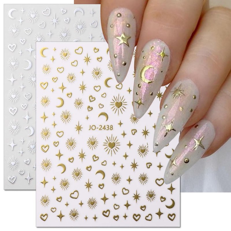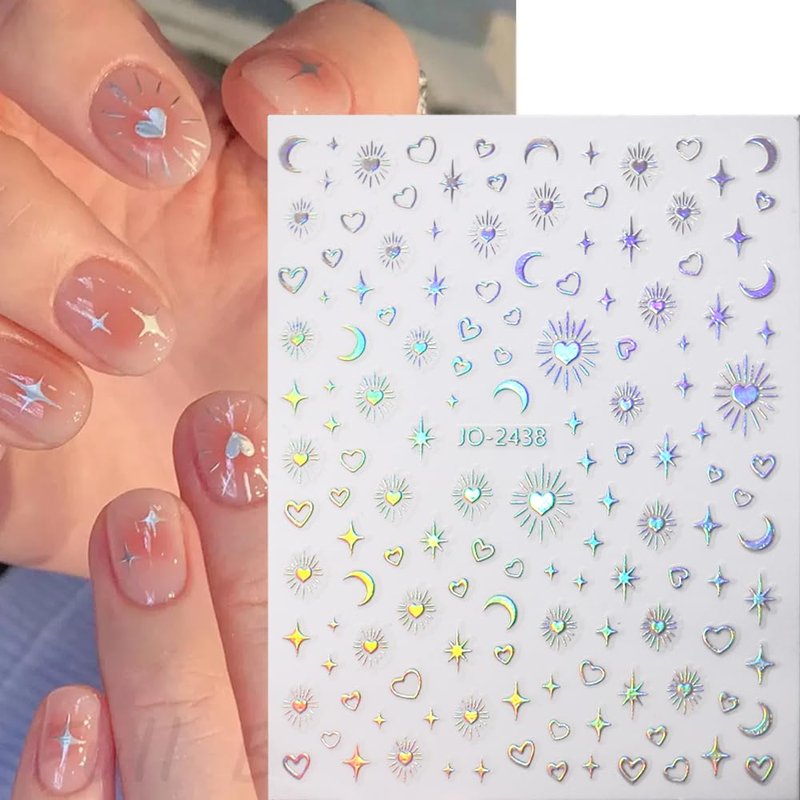 - 【Package Included】You will get 8 sheets special star moon heart design nail stickers in 4 different colors, 2 sheets for each color,including gold, silver,rose gold and laser silver,four colors for you to match/choose at will, bringing you more inspiration for nail DIY design creation.Make you have a special nail art on a date.