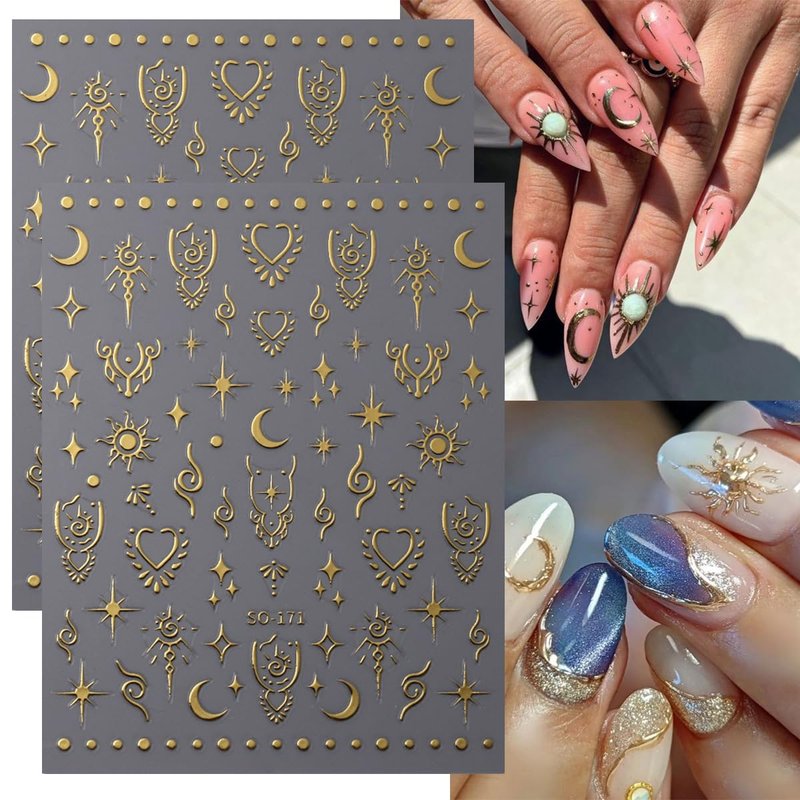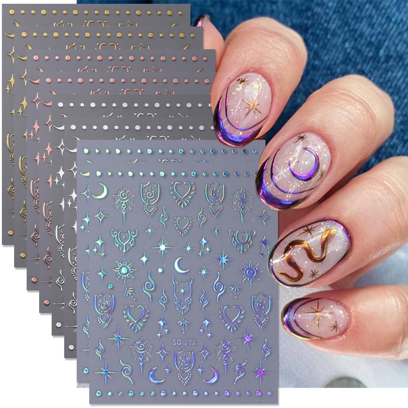 - 【Moon Star Stickers Package Set】You will get 8 sheets exquisite laser glitter glod nail stickers, various patterns nail designs decoration.Self-Adhesive decals provides you with a variety of options to give full play to your rich imagination of nail DIY.