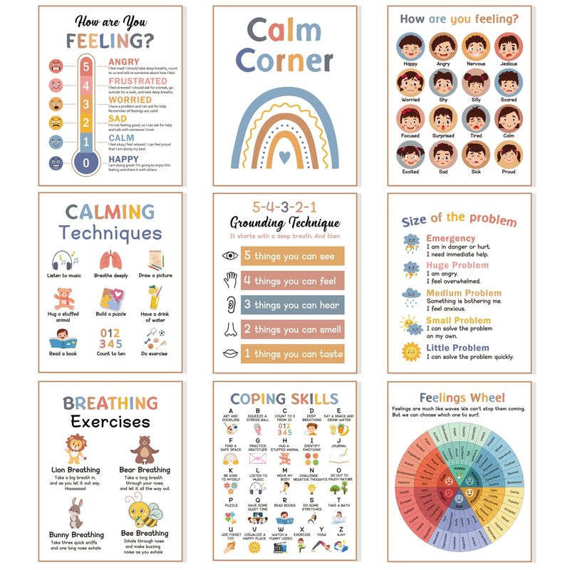- 🧡 Calming Corner Poster Kit Includes: 9 pieces posters of 8in x 10in, including a calming corner title, feelings chart, calming techniques, feelings wheel, coping skills, breathing exercises and more. They are appropriate for you to decorate classroom, home and office with a suitable frame, the frame is not included in package.