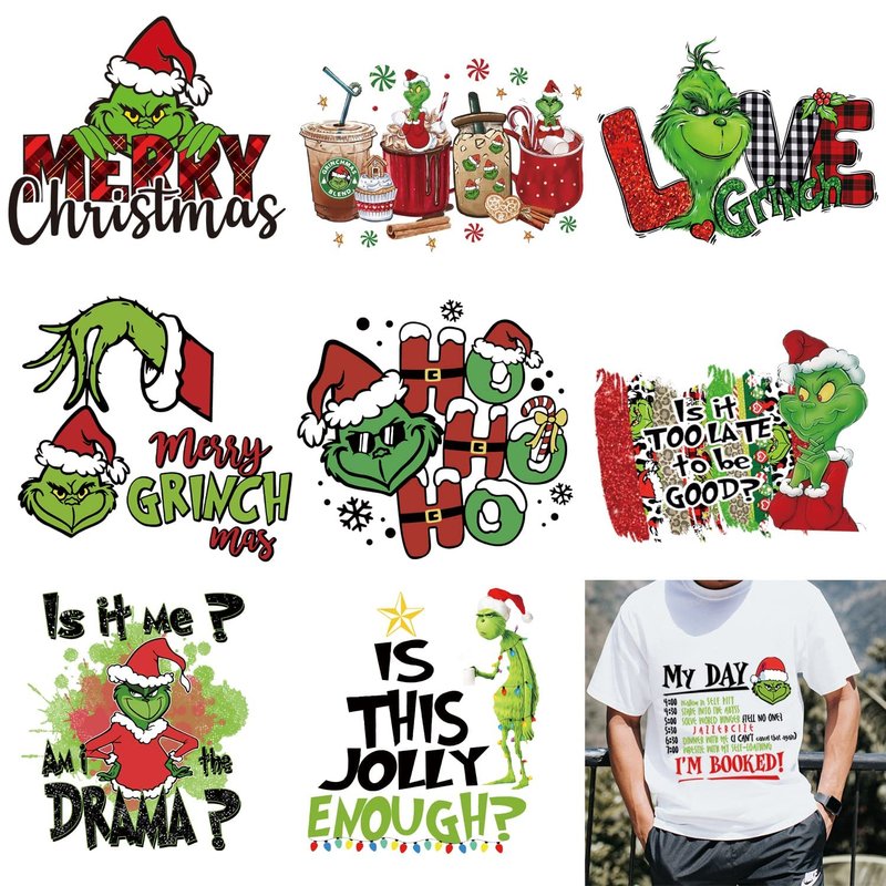 9 Pcs Christmas Iron on Decals Transfer Heat Transfer Design Sticker Iron on Vinyl Patches,Cartoon Christmas Grinch HTV Iron on Transfer Paper for Clothing Hat Pillow Backpack DIY Craft Supplies