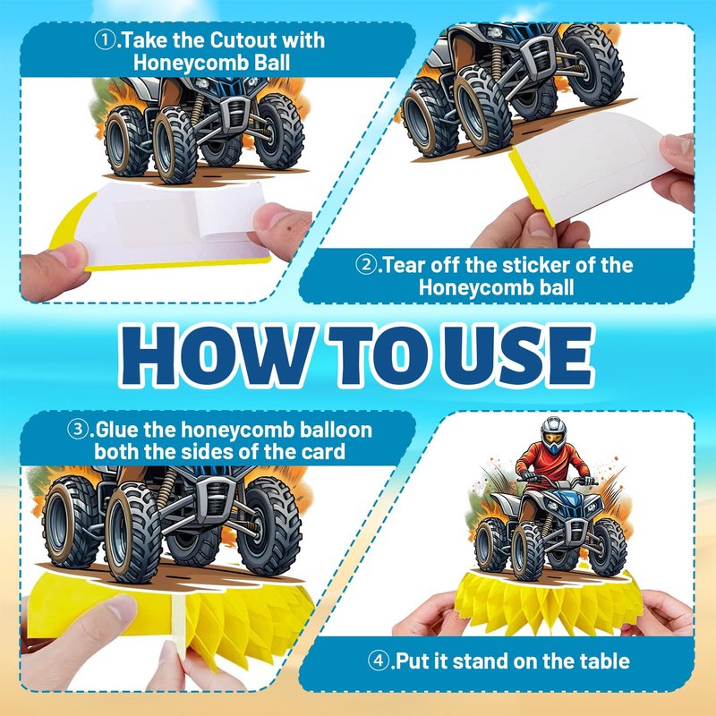 - Reliable Material and Design: These ATV birthday decorations are made of quality paper, thick and sturdy, not easy to deform. Printed with fun and bright patterns, not easy to fade. The ATV honeycomb base is easy to open and can stand firmly on the desktop for a long time