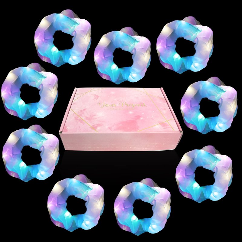 - Led Scrunchies Set: This is a magical hair scrunchies set that a beautiful box containing nine satin hair scrunchies that built in LED light, which has three light mode,so they can light up in the dark, ideal for buying to participate in glowing neon parties or gifts for girls brithday.