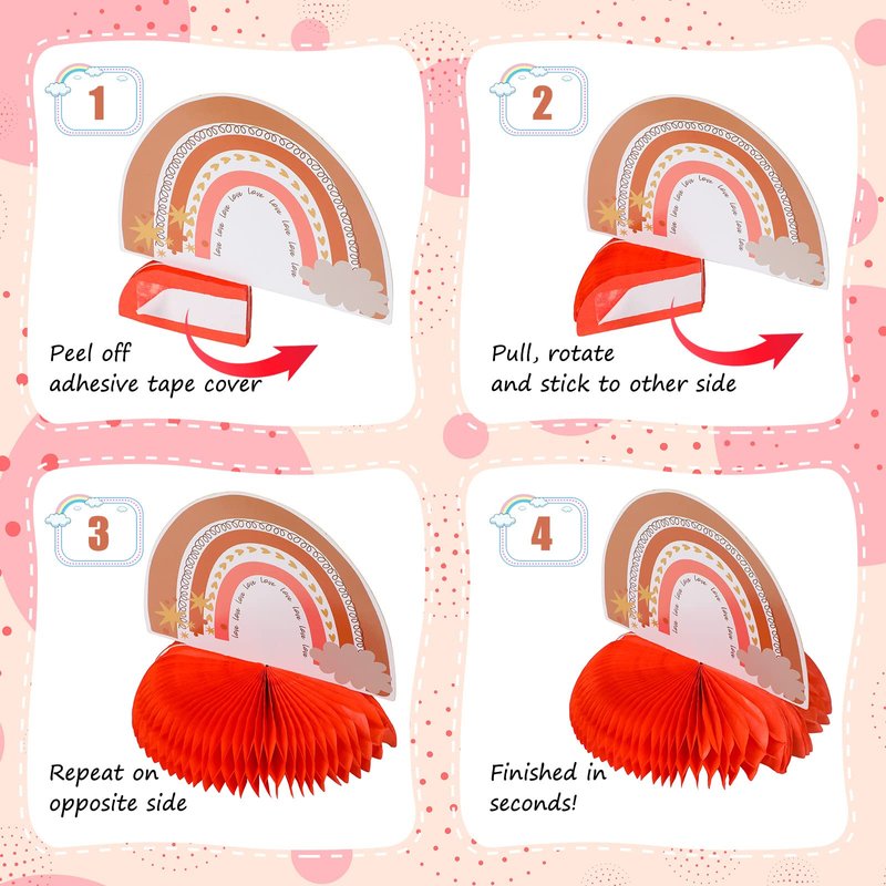 - Do Yourself: these rainbow party decorations come in a flat pack for better protection and are easy to assemble; Unfold the honeycomb of rainbow birthday party table decorations and pull the edges on both sides, then peel off the tape above on sides and glue or staple them together, saving time and effort; Once assembled, you can reuse them multiple times